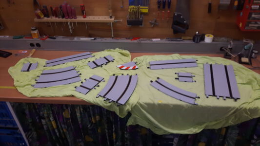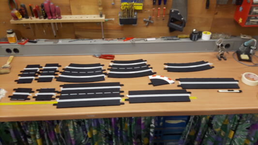 Die Original Carrera-Schiene erwies sich optisch nicht gerade prickelnd, deshalb wurde sie mit Strassengrauer Dispersionsfarbe 2-mal gestrichen bzw. mit einer Schaumgummiwalze gerollt. Natürlich nach vorherigem abkleben der Stromleiter mit Malerkrepp. Das überstehende Klebeband wurde mit einem Cuttermesser rechts und links der Stromschienen abgeschnitten. Nach dem streichen oder rollen ist es wichtig das Klebeband noch im feuchten Zustand zu entfernen um Klebereste zu vermeiden. Auf der grauen Fahrbahn zeichnen sich nach längerem Fahrbetrieb die Reifenspuren naturgetreu ab. Optisch ein Highlight, im Gegensatz zur schwarzen Carrera-Schiene.