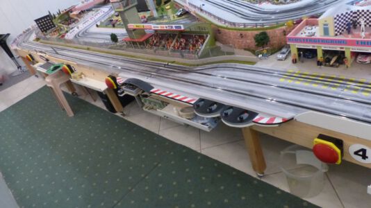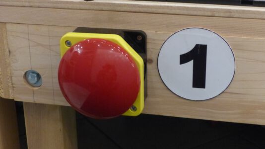 Als Chaos-Taster wurden 5 ganz normale Stromtaster eingebaut, je einen pro Startplatz. Vier Taster plus ein Notfalltaster für die Rennleitung, von dem aus auch das Rennen gestartet werden kann. Nach einiger Zeit mussten wir feststellen, dass die Treffsicherheit nicht allzu groß war und tauschten die Taster gegen robuste große Buzzer aus. Das Ganze wurde über eine USB-Box verkabelt und über Cockpit XP gesteuert. Jeder Fahrer hat so seinen ihm zugeordneten Chaosknopf, der beim Betätigen, vom System eine Durchfahrtstrafe bekommt.