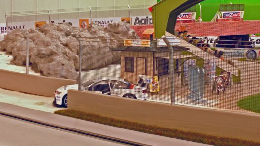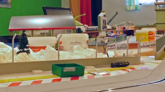 Für das Fundament kam eine 1 cm dicke Kunststoffplatte zum Einsatz. Nach dem Streichen des Sockels, die Bohrungen in das Fundament für die Zaunsäulen, und das Grundgerüst war fertig. Als Finish wurde ein anthrazitgraues Fliegengitter aus Kunststoff an die Säulen geklebt und der Gummifaden durch die Löcher gezogen. So ein Fangzaun darf auf keiner Bahn fehlen.